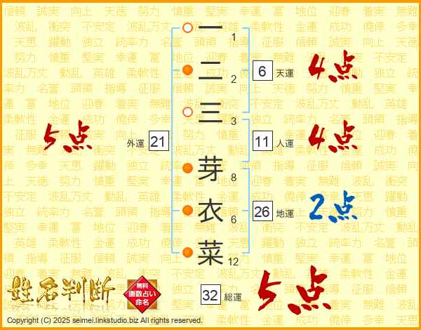 生活面を象徴する運勢です。外部から受ける影響力を表し、結婚運、家庭運や職場、環境への順応性を表します。総運から人運を引いた画数。姓や名が1文字の場合を除く。