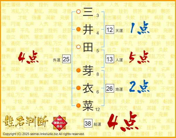 三(3画)井(4画)田(5画) 芽(8画)衣(6画)菜(12画)