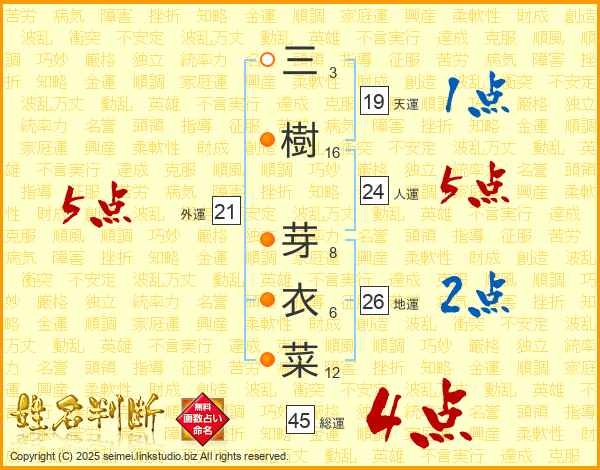 三(3画)樹(16画) 芽(8画)衣(6画)菜(12画)