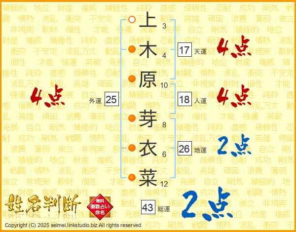 上(3画)木(4画)原(10画) 芽(8画)衣(6画)菜(12画)