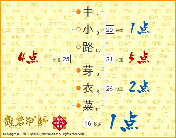 生活面を象徴する運勢です。外部から受ける影響力を表し、結婚運、家庭運や職場、環境への順応性を表します。総運から人運を引いた画数。姓や名が1文字の場合を除く。