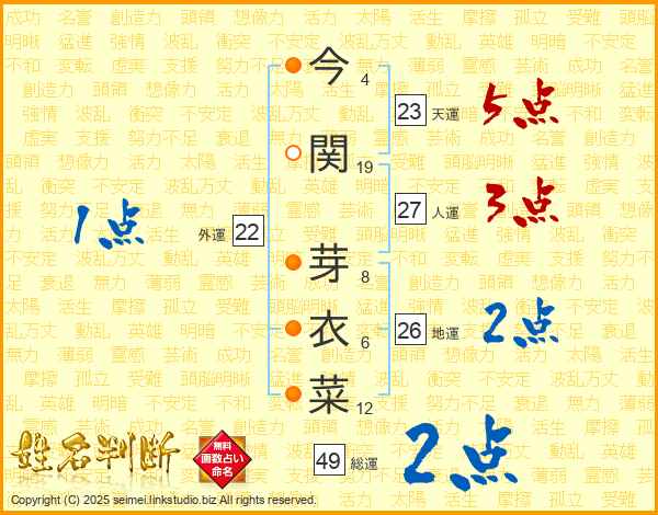 今(4画)関(19画) 芽(8画)衣(6画)菜(12画)