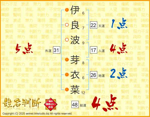 伊(6画)良(7画)波(9画) 芽(8画)衣(6画)菜(12画)
