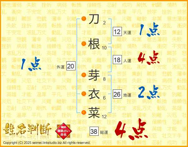 刀根芽衣菜さんの総運は38画の4点!