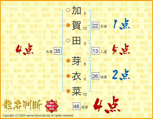 加(5画)賀(12画)田(5画) 芽(8画)衣(6画)菜(12画)