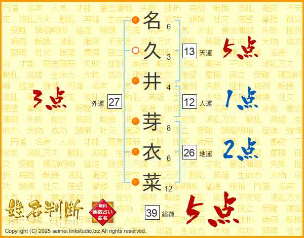 名(6画)久(3画)井(4画) 芽(8画)衣(6画)菜(12画)