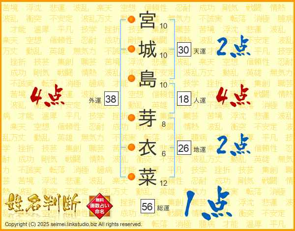 宮(10画)城(10画)島(10画) 芽(8画)衣(6画)菜(12画)