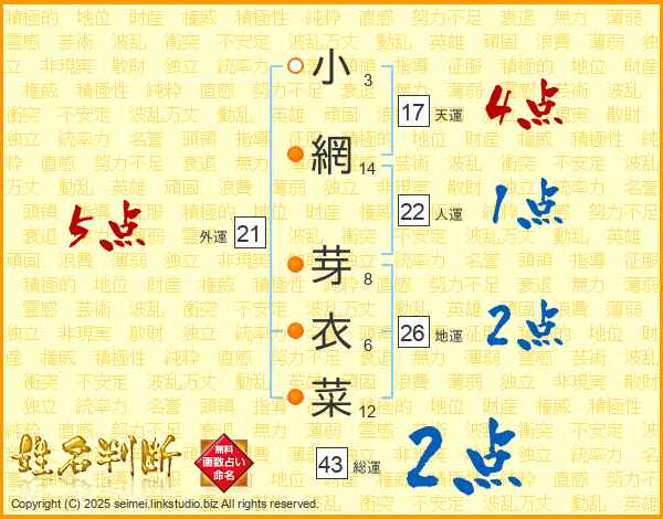 小(3画)網(14画) 芽(8画)衣(6画)菜(12画)