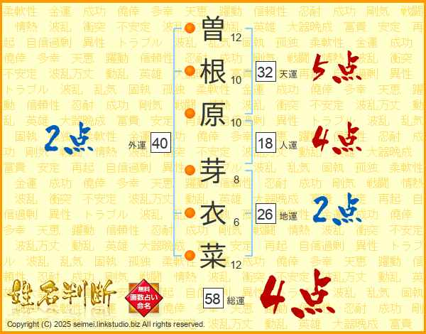 曽根原芽衣菜さんの総運は58画の4点!
