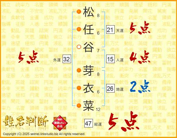 松(8画)任(6画)谷(7画) 芽(8画)衣(6画)菜(12画)