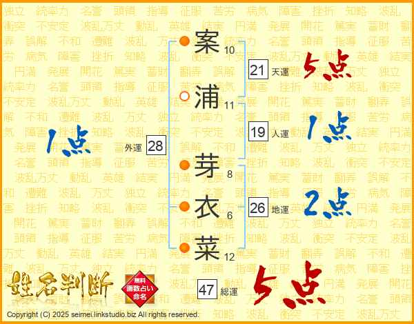 案(10画)浦(11画) 芽(8画)衣(6画)菜(12画)