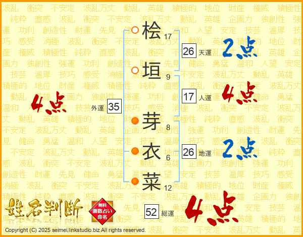 桧(17画)垣(9画) 芽(8画)衣(6画)菜(12画)