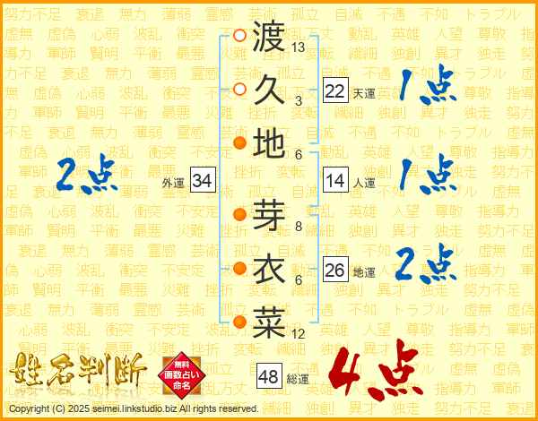 渡(13画)久(3画)地(6画) 芽(8画)衣(6画)菜(12画)
