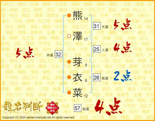 熊(14画)澤(17画) 芽(8画)衣(6画)菜(12画)