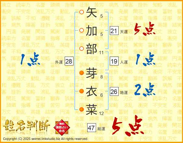 矢(5画)加(5画)部(11画) 芽(8画)衣(6画)菜(12画)