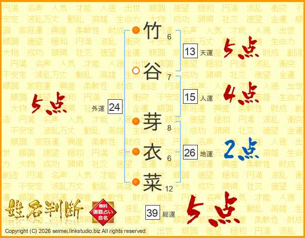 竹(6画)谷(7画) 芽(8画)衣(6画)菜(12画)