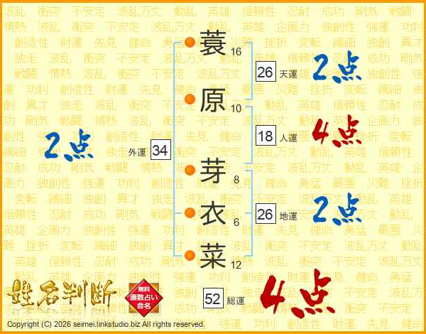 生活面を象徴する運勢です。外部から受ける影響力を表し、結婚運、家庭運や職場、環境への順応性を表します。総運から人運を引いた画数。姓や名が1文字の場合を除く。