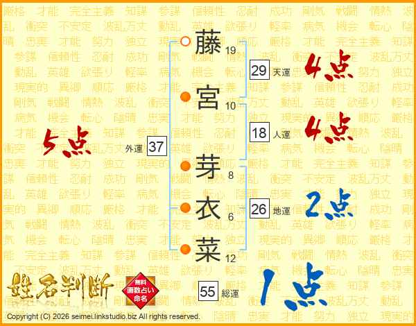 藤(19画)宮(10画) 芽(8画)衣(6画)菜(12画)