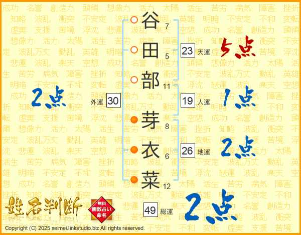 谷(7画)田(5画)部(11画) 芽(8画)衣(6画)菜(12画)