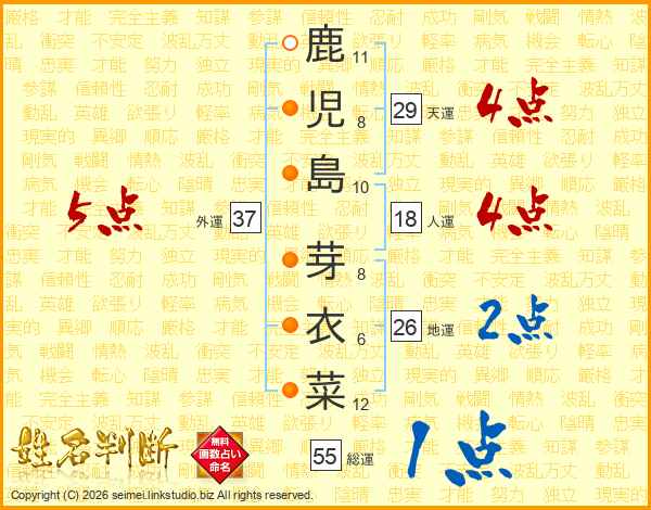 鹿(11画)児(8画)島(10画) 芽(8画)衣(6画)菜(12画)
