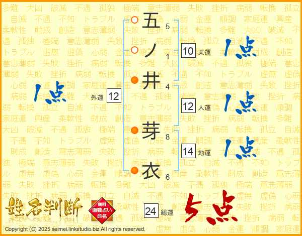 五ノ井芽衣さんの総運は24画の5点!