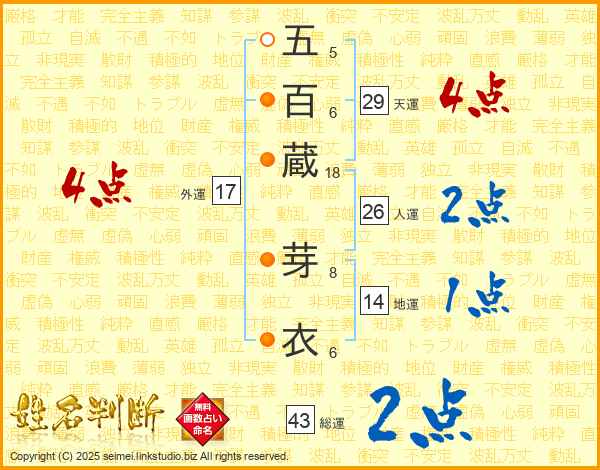 生活面を象徴する運勢です。外部から受ける影響力を表し、結婚運、家庭運や職場、環境への順応性を表します。総運から人運を引いた画数。姓や名が1文字の場合を除く。