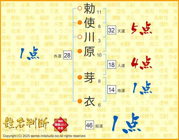 勅(11画)使(8画)川(3画)原(10画) 芽(8画)衣(6画)