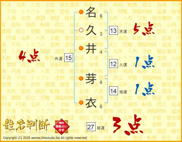 名(6画)久(3画)井(4画) 芽(8画)衣(6画)