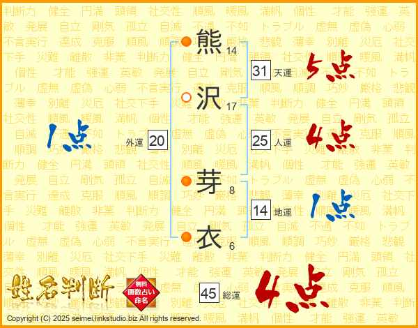 熊(14画)沢(17画) 芽(8画)衣(6画)
