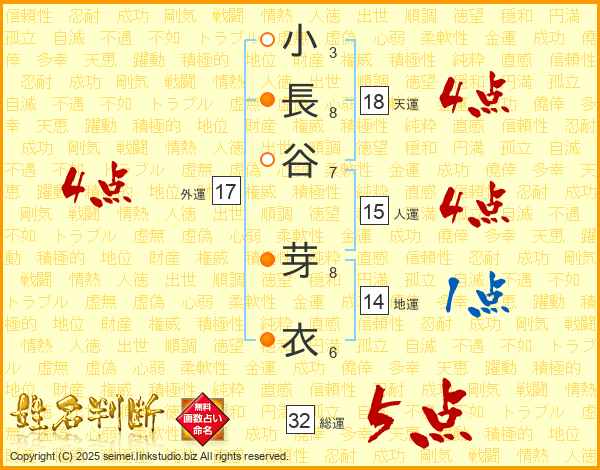 小(3画)長(8画)谷(7画) 芽(8画)衣(6画)