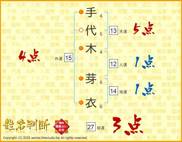 手(4画)代(5画)木(4画) 芽(8画)衣(6画)