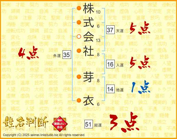 株(10画)式(6画)会(13画)社(8画) 芽(8画)衣(6画)