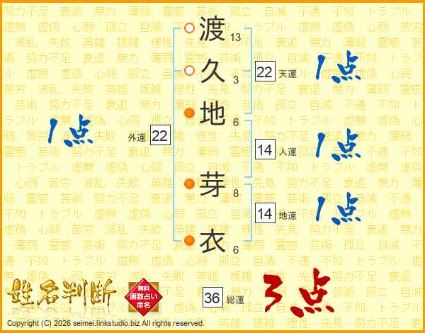 渡(13画)久(3画)地(6画) 芽(8画)衣(6画)