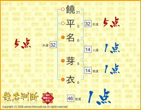 饒(21画)平(5画)名(6画) 芽(8画)衣(6画)