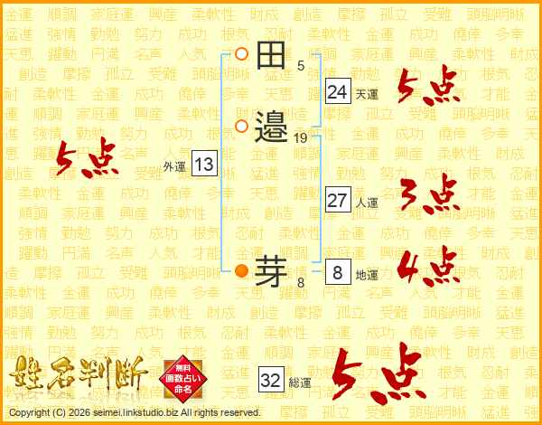 生活面を象徴する運勢です。外部から受ける影響力を表し、結婚運、家庭運や職場、環境への順応性を表します。総運から人運を引いた画数。姓や名が1文字の場合を除く。