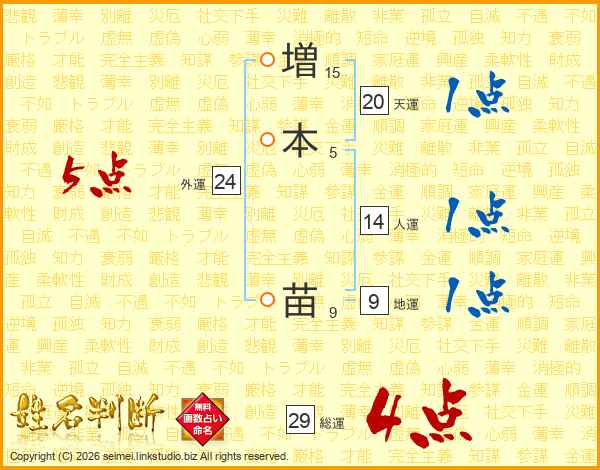 あなたの人生を表す1番重要な運勢です。生涯を通じて影響する総合運となり、主に50歳以降の晩年期に影響を及ぼします。苗字と名前の合計画数。
