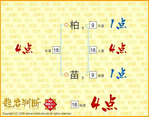 生活面を象徴する運勢です。外部から受ける影響力を表し、結婚運、家庭運や職場、環境への順応性を表します。総運から人運を引いた画数。姓や名が1文字の場合を除く。