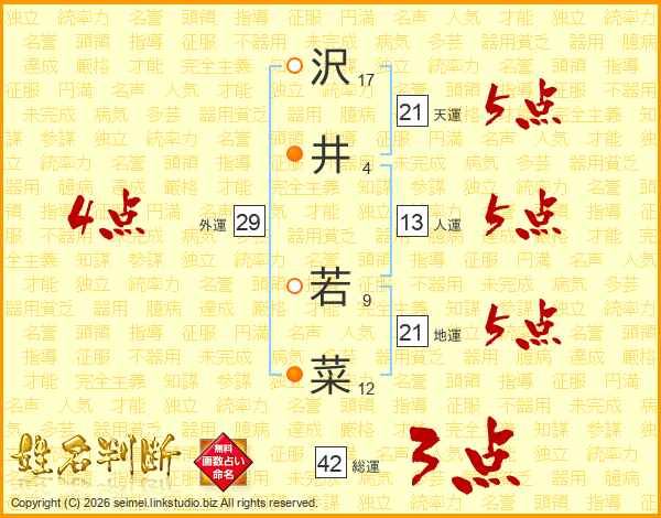 沢(17画)井(4画) 若(9画)菜(12画)