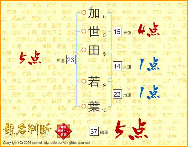 加(5画)世(5画)田(5画) 若(9画)葉(13画)
