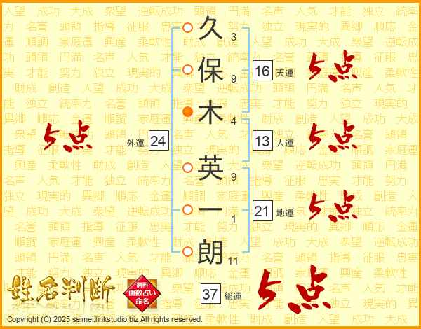 久(3画)保(9画)木(4画) 英(9画)一(1画)朗(11画)