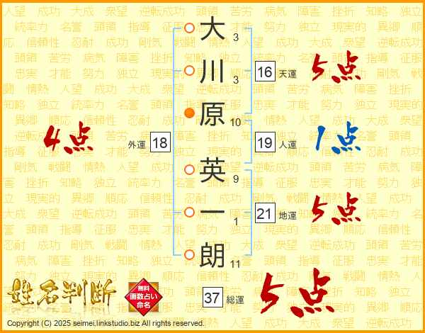 大(3画)川(3画)原(10画) 英(9画)一(1画)朗(11画)