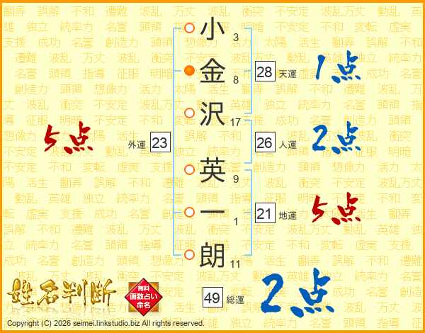 小(3画)金(8画)沢(17画) 英(9画)一(1画)朗(11画)