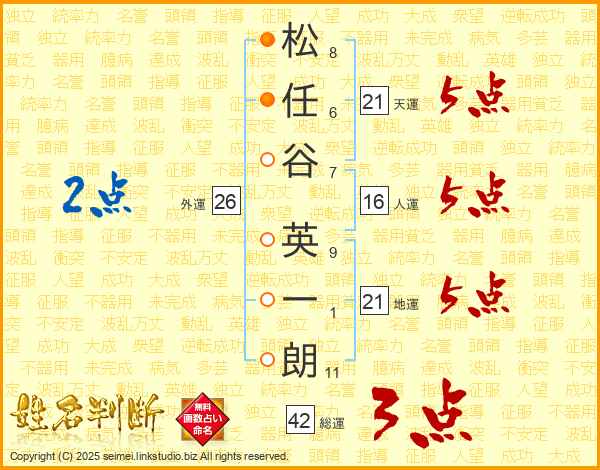 松(8画)任(6画)谷(7画) 英(9画)一(1画)朗(11画)