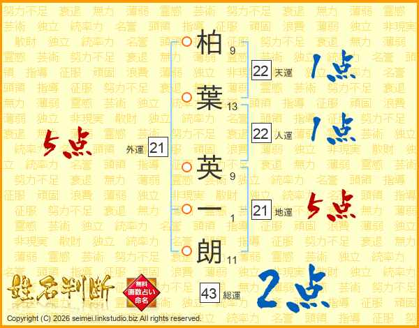 柏(9画)葉(13画) 英(9画)一(1画)朗(11画)