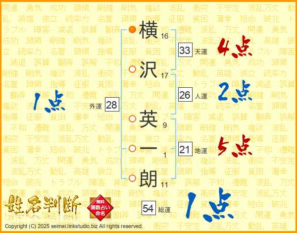 横(16画)沢(17画) 英(9画)一(1画)朗(11画)