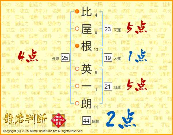 比(4画)屋(9画)根(10画) 英(9画)一(1画)朗(11画)