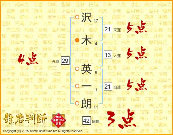 沢(17画)木(4画) 英(9画)一(1画)朗(11画)