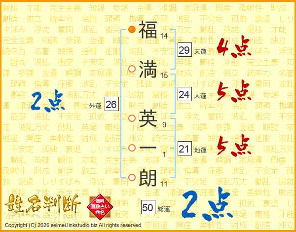 福(14画)満(15画) 英(9画)一(1画)朗(11画)