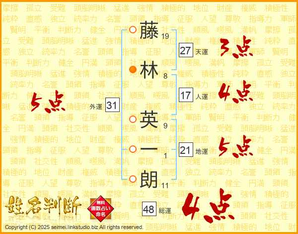 藤(19画)林(8画) 英(9画)一(1画)朗(11画)