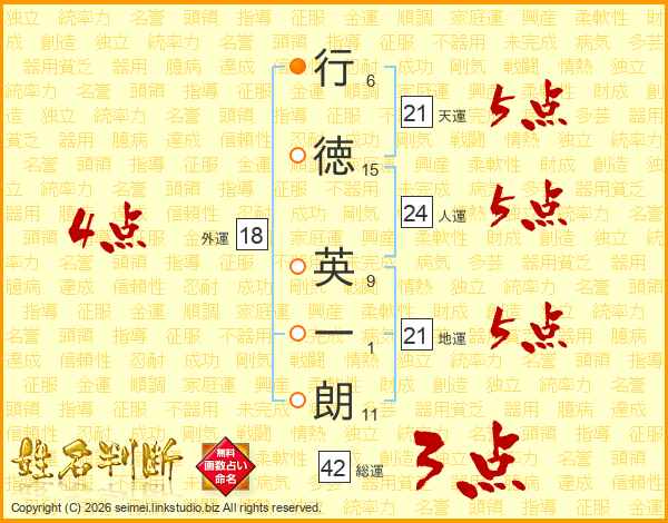 行(6画)徳(15画) 英(9画)一(1画)朗(11画)